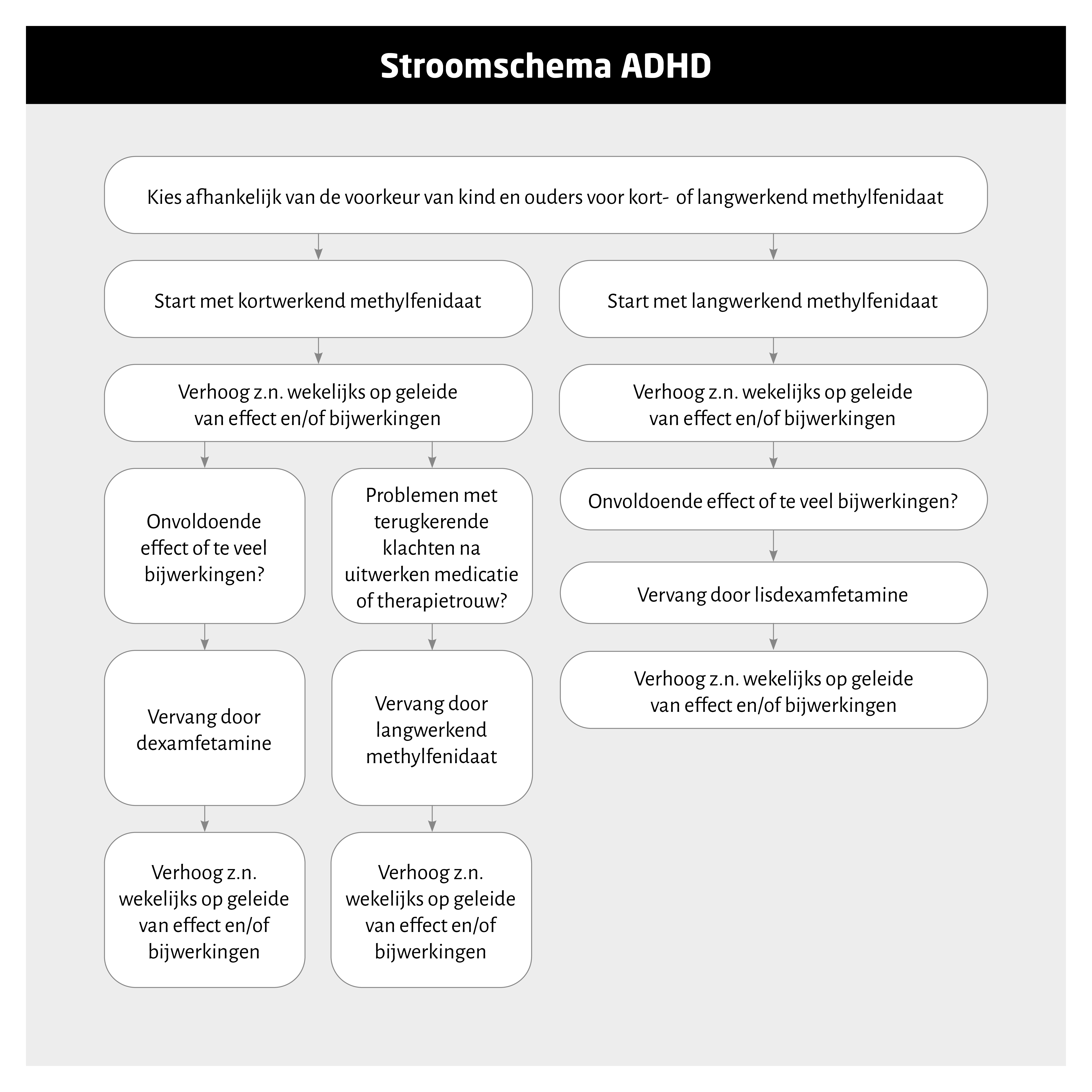 - De medicamenteuze opties bij kinderen zijn aangepast en uitgebreid. Kortwerkend en langwerkend methylfenidaat zijn nu beide eerste keus. Bij onvoldoende effect of te veel bijwerkingen van methylfenidaat zijn als tweede keus dexamfetamine en lisdexamfetamine toegevoegd.
