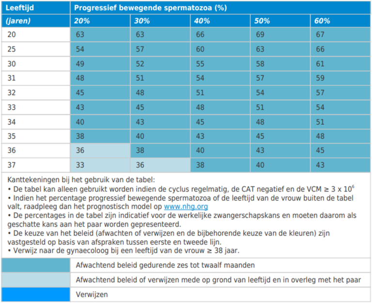 - Bij de keuze voor afwachten of verwijzen is de zwangerschapskans in het eerstvolgende jaar van belang; deze wordt geschat met een predictiemodel.